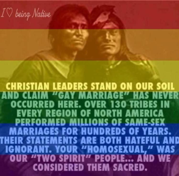 Alternative gender roles were respected and honoured, and believed to be part of the sacred web of life and society…. the judeo-Xian tradition honours the male and female gender roles within the scope of heterosexuality, but alternative sexuality is regarded as sinful and outside of god’s plan.” from ‘Two Spirit People: American Indian Lesbian Women and Gay Men’ By Lester B Brown 1997