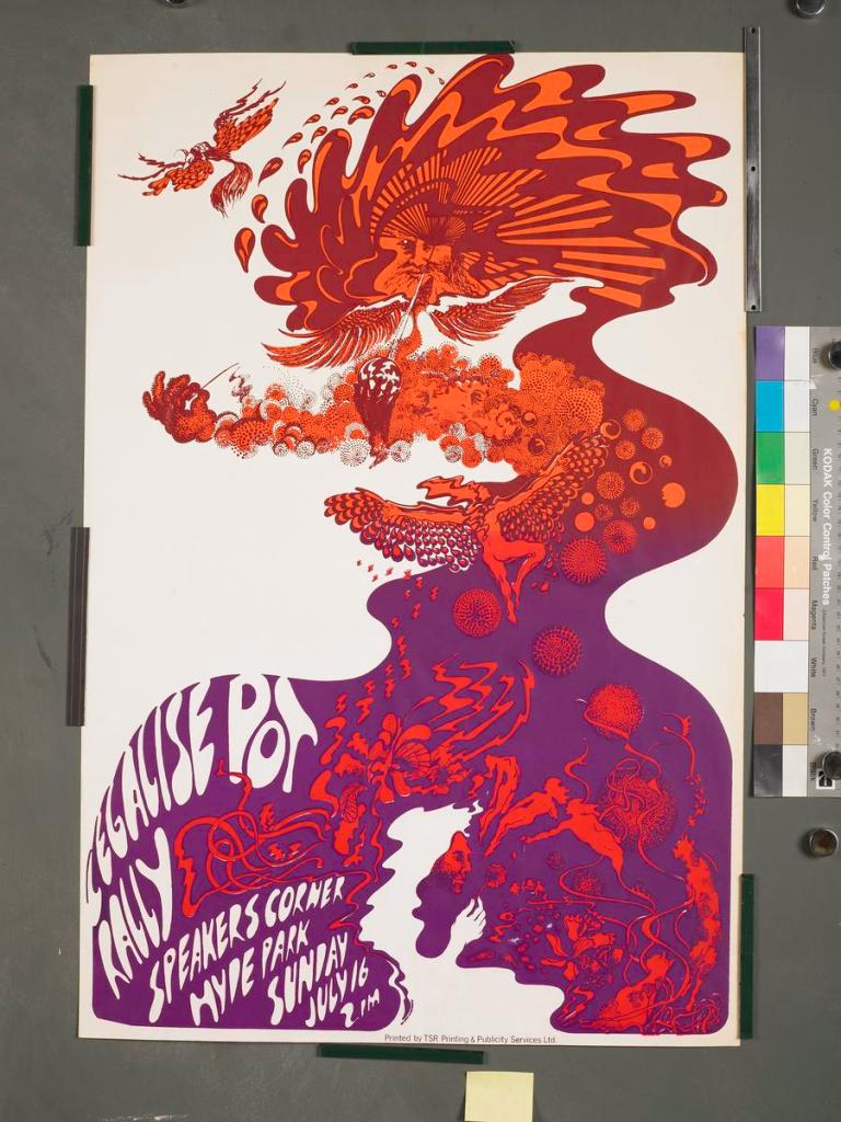 Also at the rally, and captured in a pictured with Ginsberg, was Lee Harris – a South African actor/playwright recently moved to London, who would in 1972 open the city’s first head shop, Alchemy in Portobello Road, which he ran until he retired in the mid 2010s, having first stood in 2015 as a London mayoral candidate on a ‘Cannabis is Safer than Alcohol’ platform. Lee stayed true to the cause for the whole of his life. During the 2015 election campaign he said that, in the 1960s, “divorce, gay rights, women’s rights, everyone, everything changed except cannabis and we think it’s time that this country gets rid of its archaic laws and becomes part of the 21st century.”