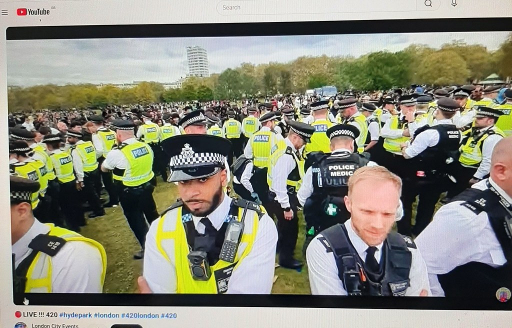 At 420 rallies across the world people come together in the name of peace and, as Bob Marley sang, One Love — and to stand against racist laws that keep one of nature’s most versatile plants illegal. But at London’s Hyde Park 420 Cannabis Rally 2026 the police were intrusive, provocative and certainly out to spoil the fun. They conducted searches and made arrests — when doing so a number of them formed a wall around the person being grappled and held down. One such man loudly declared over and over that he was being arrested for possessing one joint — on 4 20!. The impassive looks on the faces in the police wall was disturbing, though occasionally I spotted one thinking ‘wtf we doing here?’…