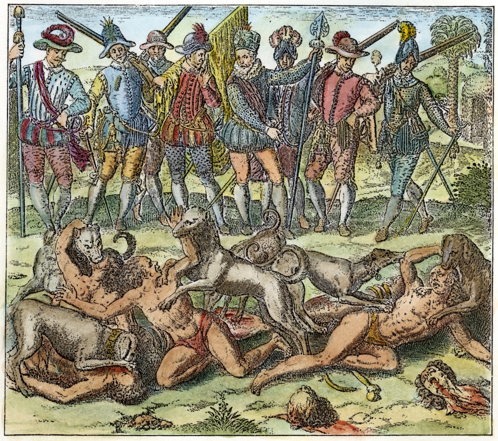 (1475-1519). Spanish explorer. Balboa ordering native Indians to be torn to pieces by dogs. Copper engraving, 16th century.