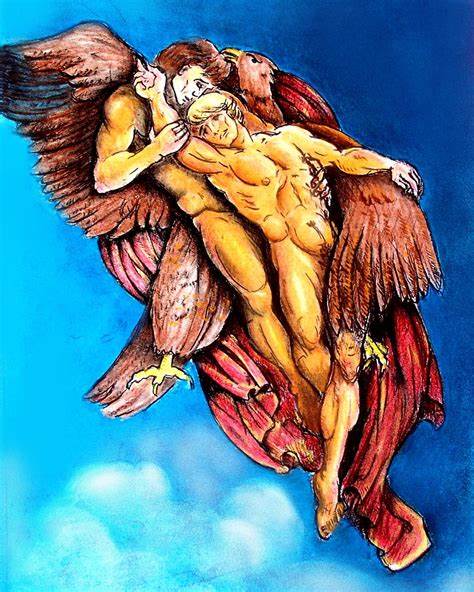 One day, looking down from his throne on Mount Olympus, Zeus spied Ganymede up in the meadows of Mount Ida, chilling with his friends under the watchful gaze of his aged tutors. Instantly, the King of Heaven flamed with love for the young Trojan’s thighs. Zeus shook himself once and turned into a powerful eagle. Straightaway he swooped down upon the world of men. Casting shafts of lightning every which way, he whipped up a fierce tempest turning day into night. Under cover of the storm the majestic eagle pounced and tenderly seized the boy in his talons. The aged guardians reached out to stop him, the hounds barked madly. Paying them no heed, the god and the boy rose up higher and higher and vanished into the blue.